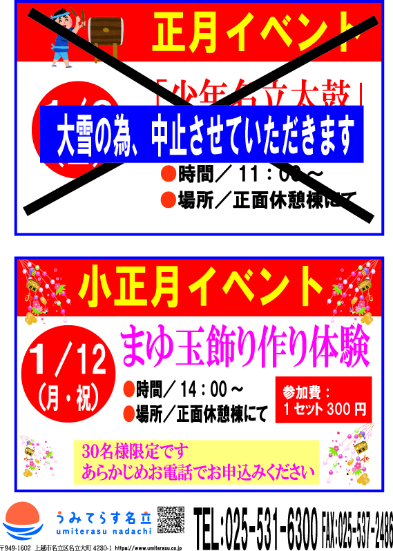 明日1月3日の正月イベント「少年名立太鼓 新年初打ち」は大雪の為、中止させていただきます