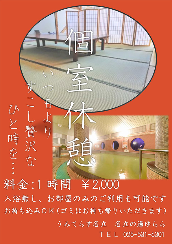名立の湯ゆららからのご案内 個室のみのご利用を承っております