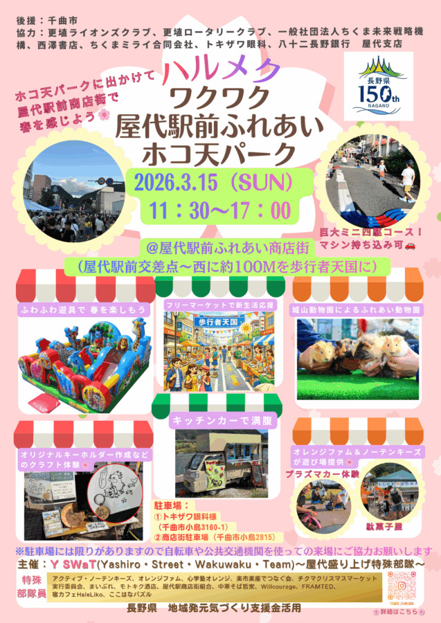 3月15日(日)に長野県千曲市屋代駅前ふれあい商店街にて「ハルメクワクワク屋代駅前ふれあいホコ天パーク」が開催されます。