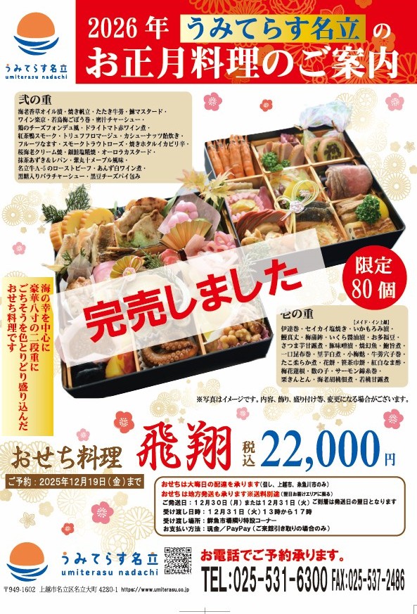 うみてらす名立のお正月料理 オードブル、お寿司、お刺身のご注文はお電話にて承っております(025-531-6300)おかげ様でおせち飛翔は完売しました