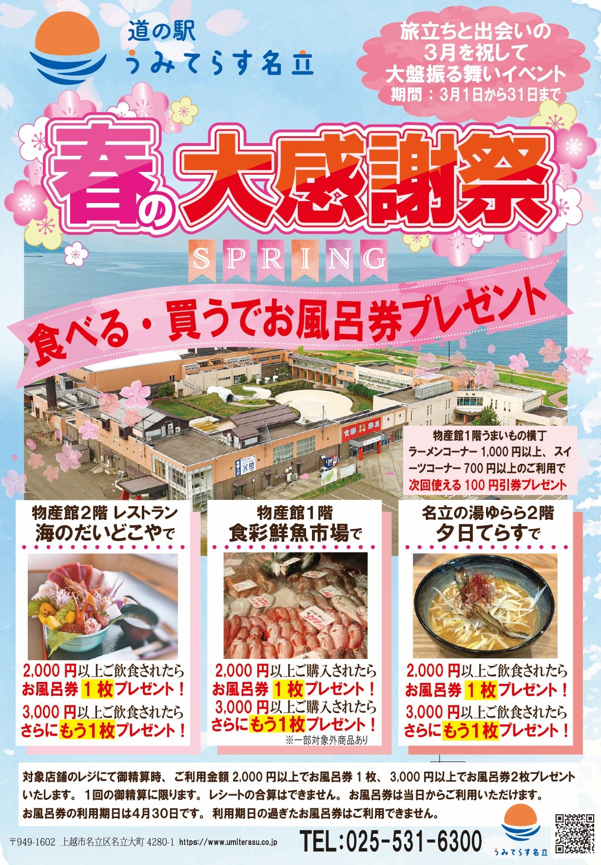 うみてらす名立の春の大感謝祭 いよいよ3月1日からスタートします! 更新日時:2026年02月28日 旅立ちと出会いの3月を祝した大盤振る舞いイベントです 食べる・買うでお風呂券をプレゼントさせていただきます 2,000円以上で1枚、3,000円以上でさらにもう1枚プレゼント! 対象店舗は下記をご覧ください