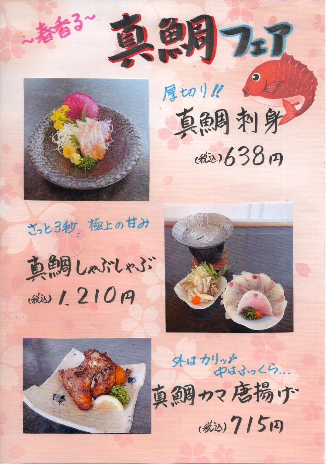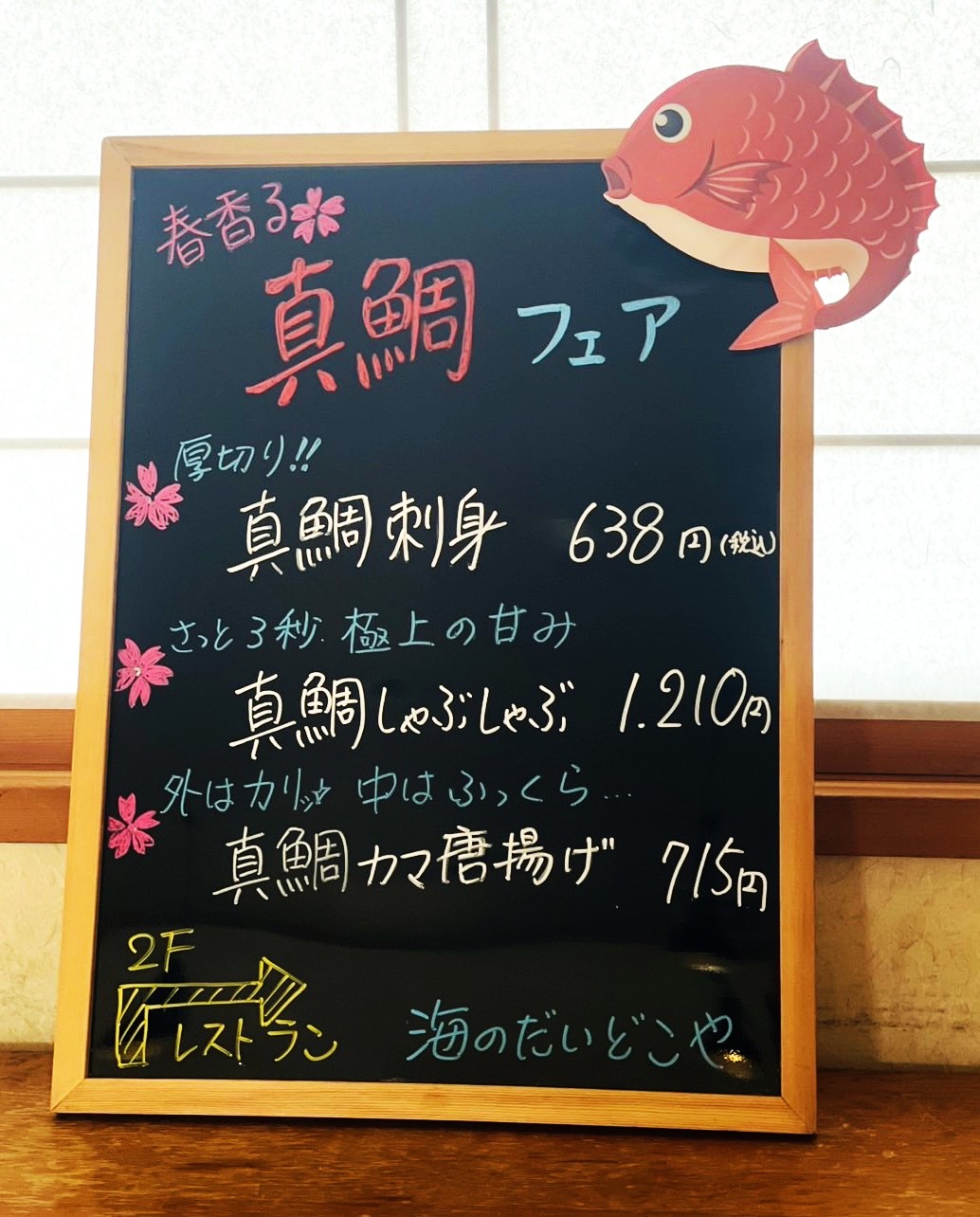 海のだいどこや ~春香る~真鯛フェア スタートします(3月7日から3月29日まで) 更新日時:2026年03月06日 鯛が美味しい春がやって来ました。 物産館2階のレストラン海のだいどこやでは、3月7日から3月29日まで、~春香る~真鯛フェアがスタートします。